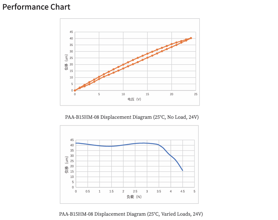 *Displacement test: drive voltage range 0 to 150V, tolerance ±15%